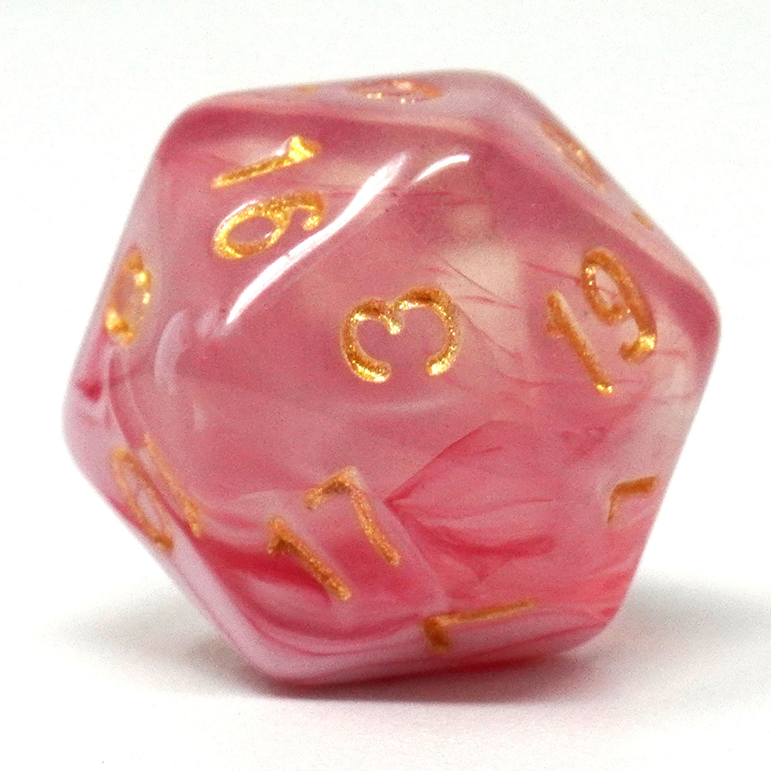 Lollipop – Indulge your tabletop cravings with this delectable 7-piece acrylic ensemble, where vibrant red and sweet white swirl into clear dice. Each die, adorned with lustrous gold lettering, captures the whimsy of a candy-filled dreamscape. With every roll of the "Lollipop" set, taste the sugary sweetness, envision a world of confectionery delights, and let the magic of tabletop gaming become a feast for your senses. 🍭🎲🌈✨