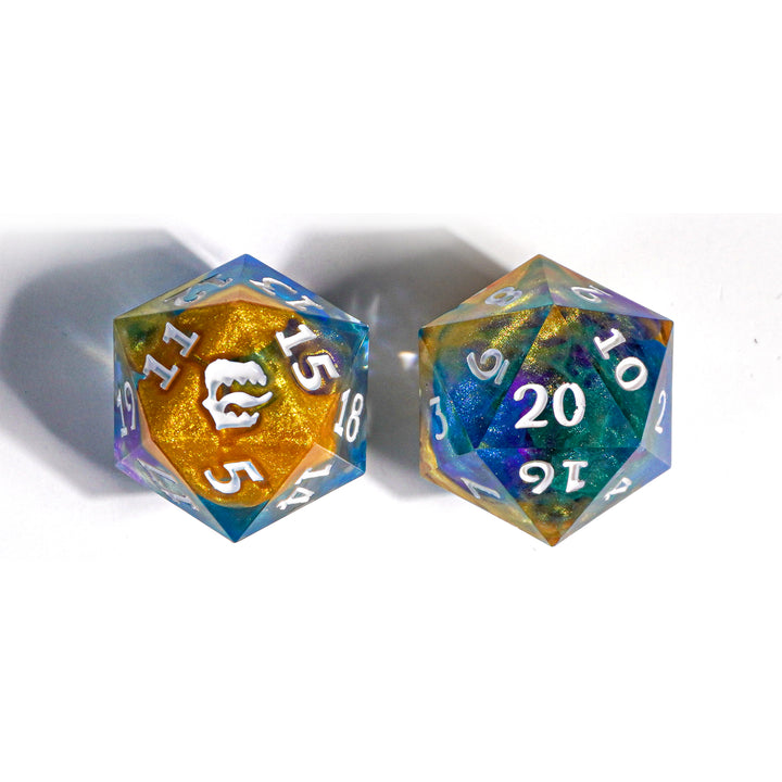 Step into a tale of magic and mystery with Sands of Time, an 11-piece dice set inspired by the shimmering deserts of legend. Crafted from transparent resin, these dice hold swirling blue, green, and gold sand, evoking enchanted dunes and glittering oases hidden in faraway lands. Marked with brilliant white text, every roll feels like part of an epic story.